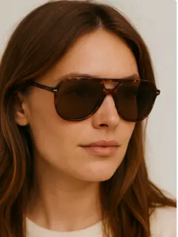 Su armazón en carey marrón, con vetas cálidas y un acabado refinado, aporta personalidad y hace que el lente destaque sin necesidad de exagerar. Los cristales en marrón pleno brindan una visión más suave, reducen el deslumbramiento y ofrecen protección UV400 para un uso prolongado al sol.